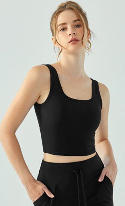 Scoop neck padded (removable) tank with Criss cross back. This wide strap tank gives you the coverage of a tank with the support of a bra. Super soft and looks great with MB Cargo leggings.
